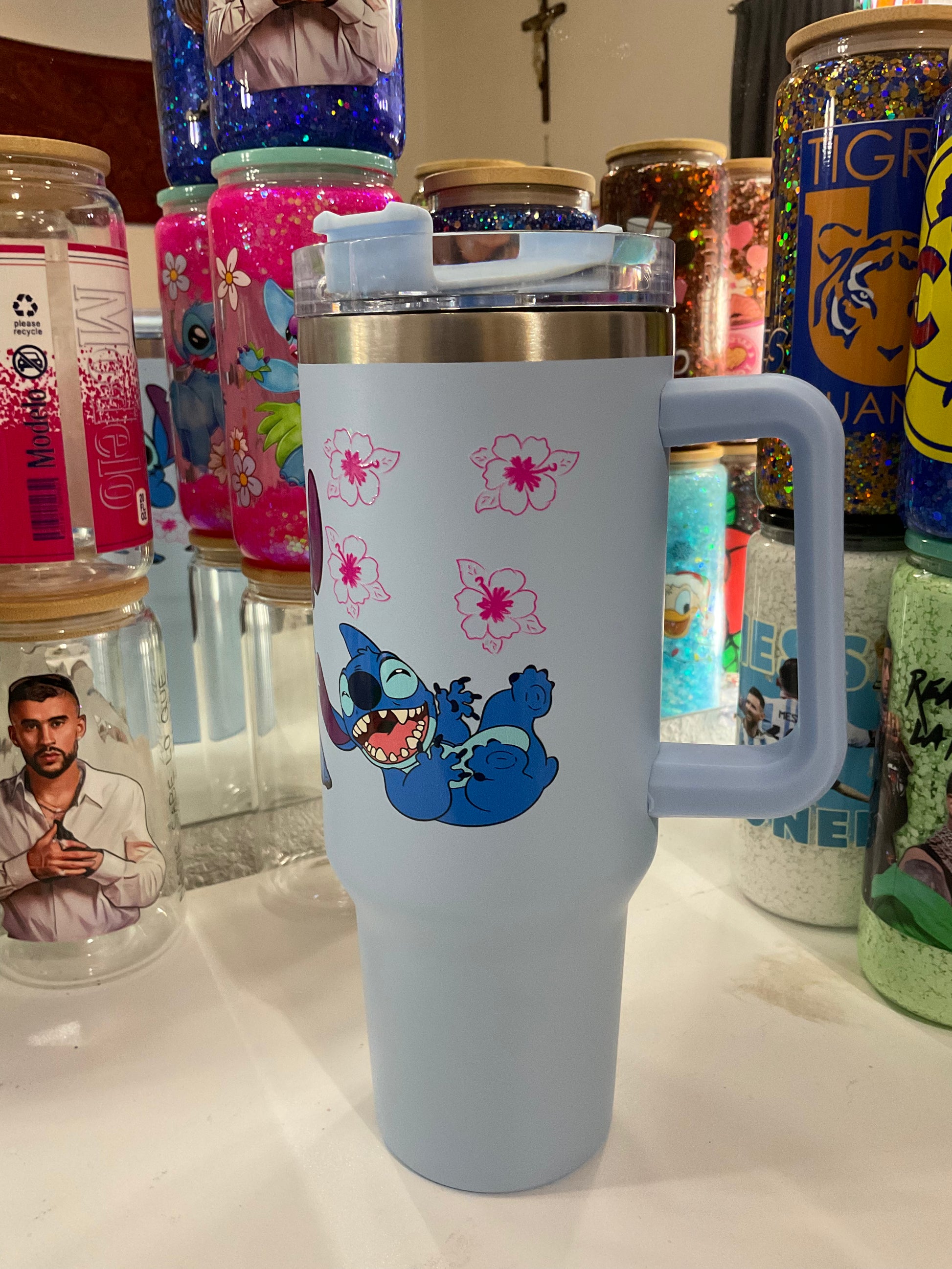 40 oz blue stitch tumbler, there is one flaw on the wrap…the flower as seen in the last picture didn’t come off fully, but this doesn’t affect the use of the cup! there is only one of these available!